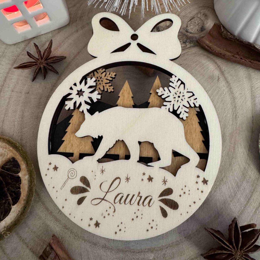 Dodajte Vianociam nádych prírody. Drevená vianočná ozdoba s menom - medveď (3 vrstvy) je starostlivo vyrezávaná a dokonale bude ladiť k vašej vianočnej výzdobe