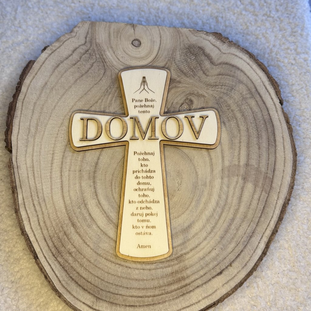 Drevený krížik s nápisom Domov – symbol ochrany, pokoja a lásky. Vyrobený z kvalitnej preglejky, precízne vyrezaný a gravírovaný laserom. Ideálny ako dekorácia alebo darček do nového bývania.
